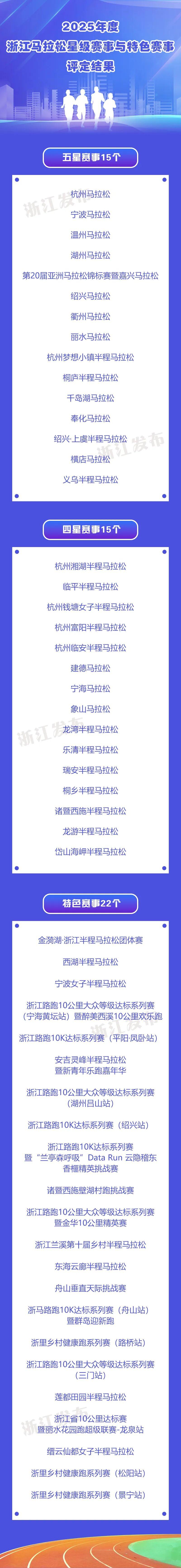 日前,2025年度浙江马拉松星级赛事与特色赛事评定结果公布。其中,杭州马拉松等15场赛事荣膺五星赛事,杭州湘湖半程马拉松等15场赛事荣膺四星赛事,另有22场赛事凭借鲜明的地域特色、优质的赛事服务获评特色赛事。
