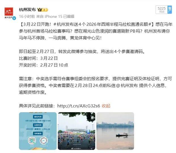 现有4个2026年西湖半程马拉松直通名额,关注并转发“杭州发布”置顶微博,即有机会获得。
