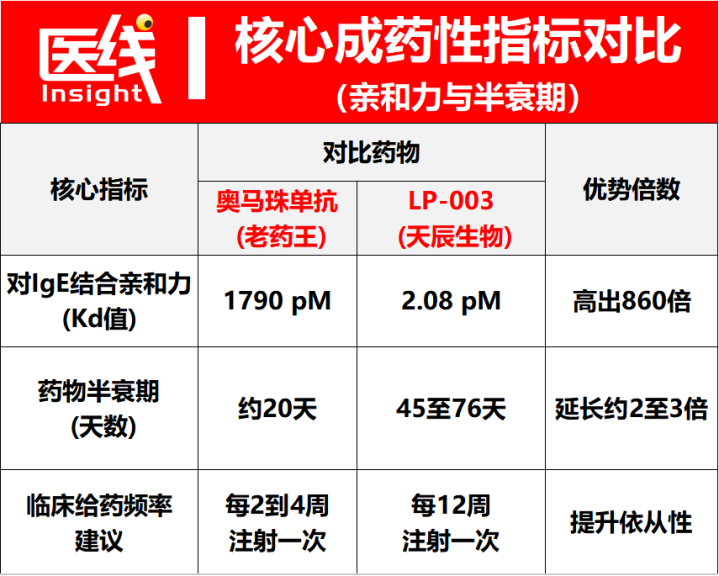 同时,在体外生物活性检测中,LP-003阻断IgE与高亲和力IgE受体(FcεRIα)结合的活性,比奥马珠单抗高出30倍。这意味着,其只需极少的剂量,就能死死“咬住”血液和组织中的游离IgE,从源头切断过敏反应。