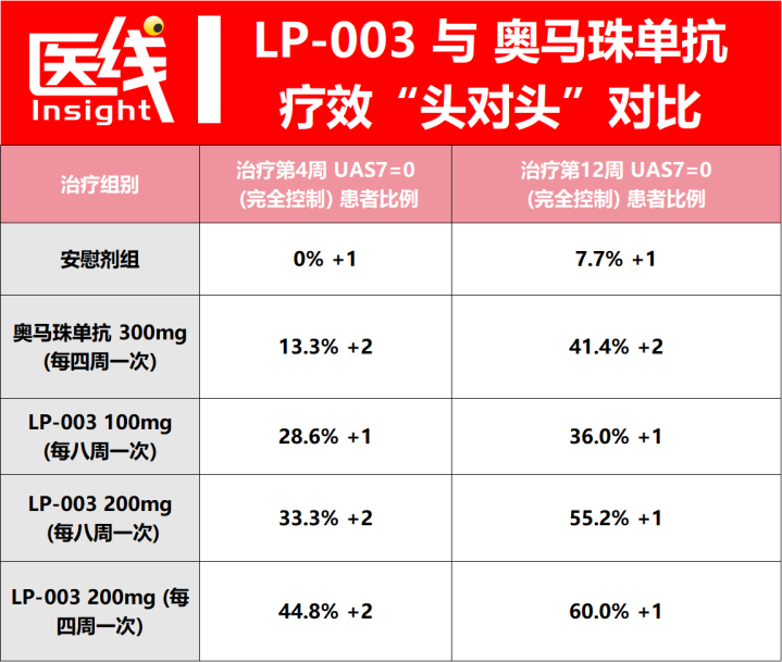 在治疗后第4周时,LP-003高剂量组(200mg,每四周给药一次)达到UAS7=0的患者比例高达44.8%;而同频率的奥马珠单抗组(300mg,每四周给药一次),这一比例仅为13.3%。