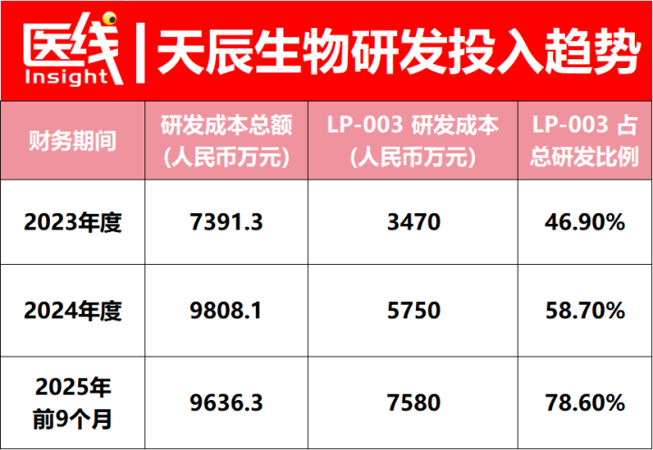 其中,核心产品LP-003是最大的资金“吞金兽”。2023年、2024年及2025年前9个月,LP-003相关的研发支出分别为3470万元、5750万元、7580万元,占当期研发总额的比例从46.9%一路飙升至78.6%。